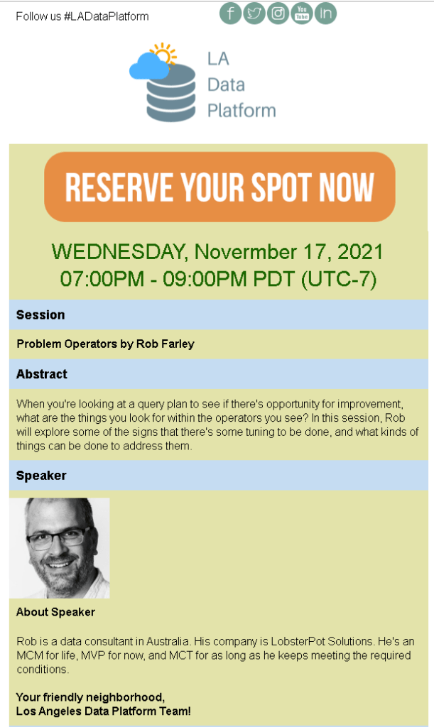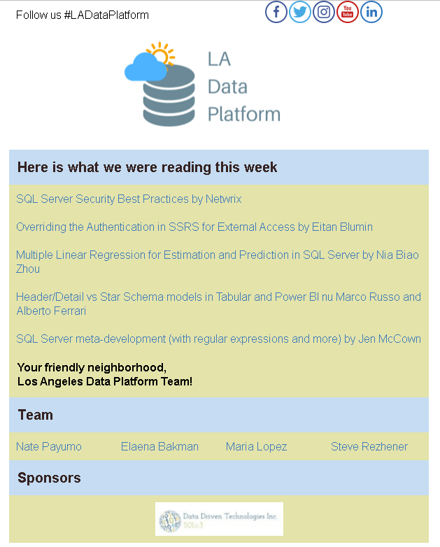 The Data Driven Technologies Team is running Los Angeles Data Platform User Group virtually for 2-3 years now. We have also organized and delivered 2 Virtual SQL Saturday in Los Angeles events (2020 and 2021).