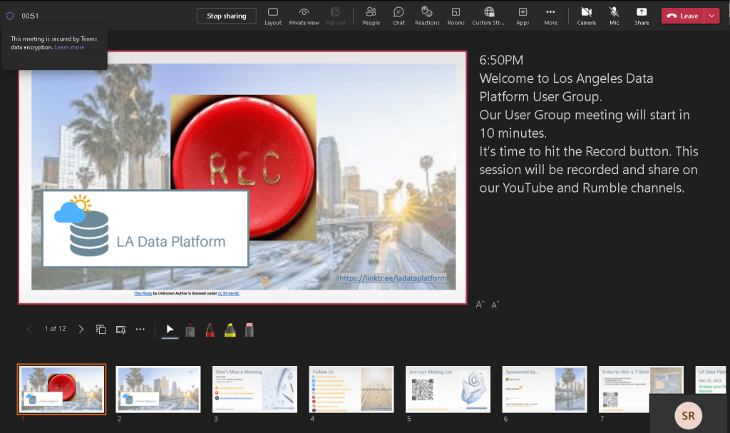 Thimantha – Thimantha helped us to deliver the first ever LA Data Platform User Group meeting that was live streamed to the world outside of MS Teams. During our 2022 January User Group meeting, we added a live stream to Facebook Live (using OBS Studio, Restream.io, and Facebook) in addition to running our meeting using MS Teams.